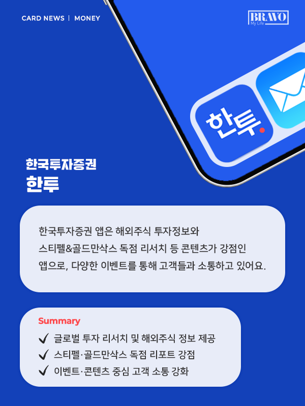 결국 앱마다 가진 특성이 다르기 때문에 무엇을 우선시하느냐에 따라 선택은 달라질 수밖에 없다. 주식 투자 앱 선택이 고민이라면, 인기 증권사 앱 특징을 카드뉴스로 확인해 보자.
