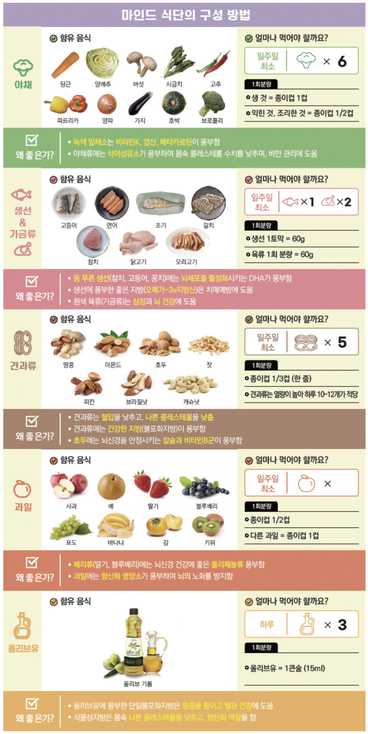 이때 강조되는 것이 바로 마인드(MIND) 식단이다. 이는 지중해식 식단과 고혈압 예방식(DASH)을 결합한 방식으로, 알츠하이머병과 치매 발병 위험을 30~53%까지 낮추는 효과가 있음이 과학적으로 입증되었다.