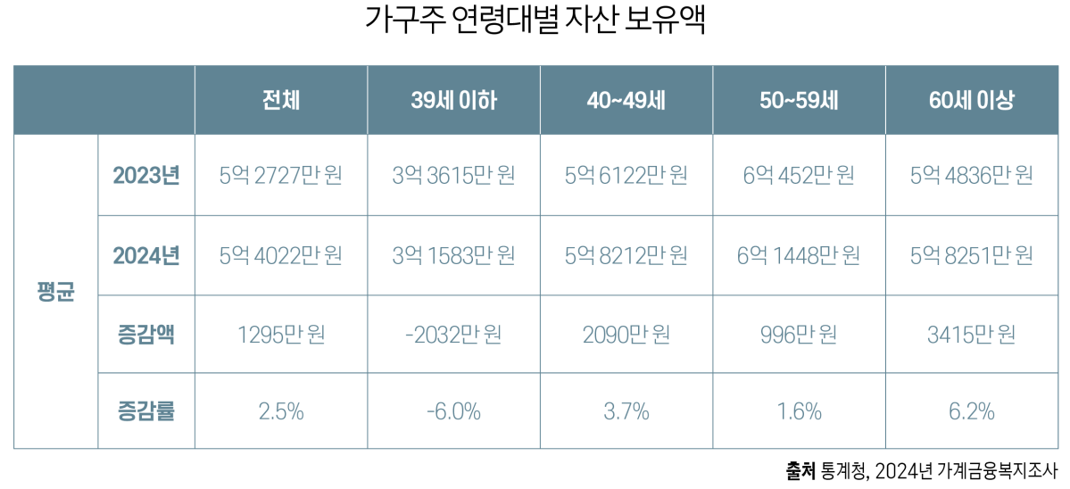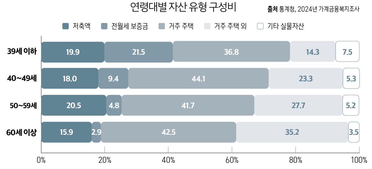 한국 고령층 부부의 자산 구성에서 부동산 비중은 과도하다. 지난해 통계청 가계금융복지조사 결과를 보면 가구주 연령대별 자산 보유액은 전체가 5억 4022만 원이다. 50세에서 59세가 6억 1448만 원으로 다소 많고, 60세 이상이 5억 8251만 원으로 오히려 줄어드는 것을 알 수 있다. 그 사이 의료비나 자녀의 결혼 등 지출이 발생해서 자산 규모에 변화가 있었다는 의미다.