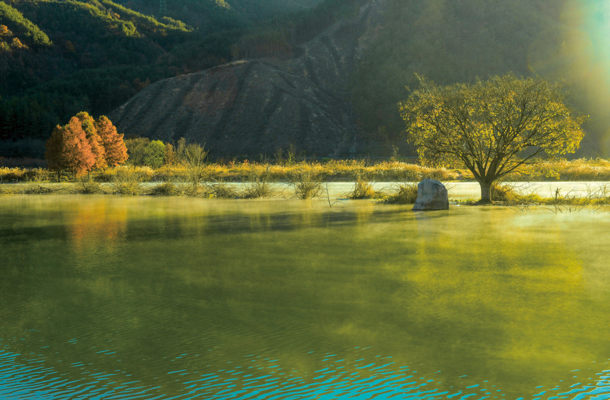 수면 위로 피어오르는 물안개가 몽환적인 분위기를 만들어내더니 물속의 작은 섬들이 서서히 모습을 드러낸다. 햇살의 방향에 따라 풍경이 달라지고, 호수의 담수량에 따라 물안개의 풍성함이 달라진다. 물안개는 우리에게 그 아스라함을 오랫동안 보여주지 않는다. 금방 사라지는 자욱한 물안개 속으로 호수의 잔물결에 새벽빛이 반짝반짝 튕겨나간다. 푸른 하늘과 아침 햇살을 담은 맑은 호수 저편으로 가을 색감이 엿보이기 시작했다.