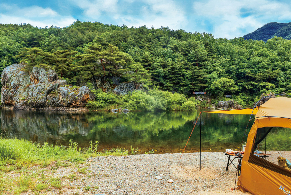 그냥 지나칠 수 없는 용담 섬바위는 용담호에서 자동차로 5분 정도 거리에 있다. 용담댐 하류 강가에 섬처럼 솟아 있다. 막상 들어서면 고즈넉한 첫인상이 편안하다. 웅장한 섬바위를 마주 바라보고 있으면 아늑하고 차분해진다. 금강이 흐르는 캠핑장 섬바위는 몇 년 전 가수 이효리를 비롯한 핑클 멤버들이 ‘캠핑클럽’이라는 타이틀로 캠핑을 즐기며 여행하는 프로그램에 소개된 바 있다. 이곳 용담 섬바위가 그들의 첫 정박지였다. 요정들이 살 것 같은 비현실적인 자연이라는 그들의 말처럼 천년송을 품은 10m 높이의 섬바위가 물속에서 고고하다. 물가의 수초들은 자연스럽게 꽃을 피우고 바람에 살랑인다. 가히 물멍 명당이다. 누구라도 하루 종일 이 속에 푹 파묻히고 싶을 듯하다. 잠깐 바라보고 가려다 자동차 트렁크의 캠핑 의자를 꺼내지 않을 수 없다. 옆으로는 숲속 산책로가 있다.