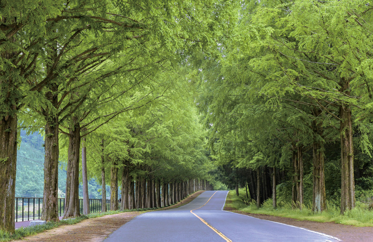 옛 지방 도로 모래재길이기도 한 진안의 부귀 메타세쿼이아길은 1.5km 정도 구간이다. 도로 양옆의 산책로에 들어서면 울창한 숲에 들어온 기분이다. 오래된 나무에서 특유의 향기가 뿜어져 나와 산림욕장의 힐링을 맛본다. 흔히 쭉 뻗은 직선의 가로수길과는 달리 살짝 높낮이가 있어 여유롭게 돌아가는 곡선의 모양새가 이 길의 또 다른 매력이다. 이런 풍경 덕분에 영화나 드라마, CF에서 종종 보게 되는 길이다. 진안의 메타세쿼이아길이 환영하듯 멋지게 가을을 초대한다.