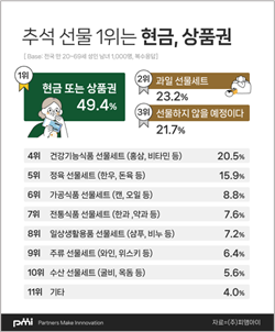 선물 품목은 현금·상품권이 49.4%로 1위를 차지했다. 과일(23.2%), ‘선물 안 함’(21.7%), 건강기능식품(20.5%), 정육(15.9%)이 뒤를 이었다. 전달 방식은 ‘직접 구매·직접 전달’이 42.8%로 최다였으며, 모바일 상품권·기프티콘 비중은 10.9%로 전년(7.4%) 대비 상승해 디지털 선물 문화가 확산되는 흐름을 보였다.