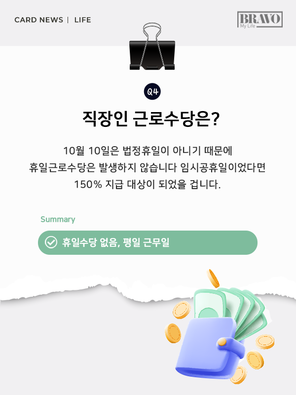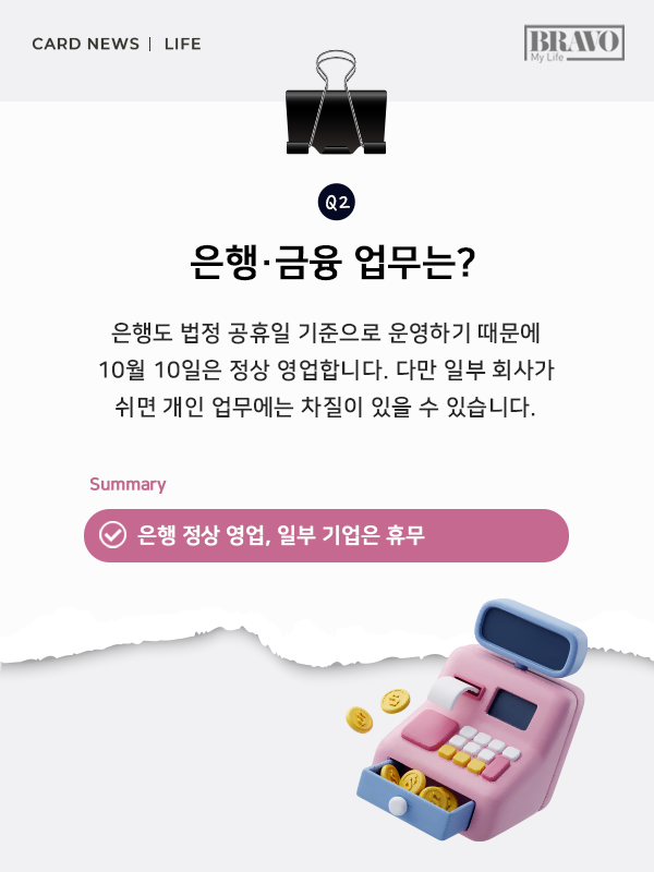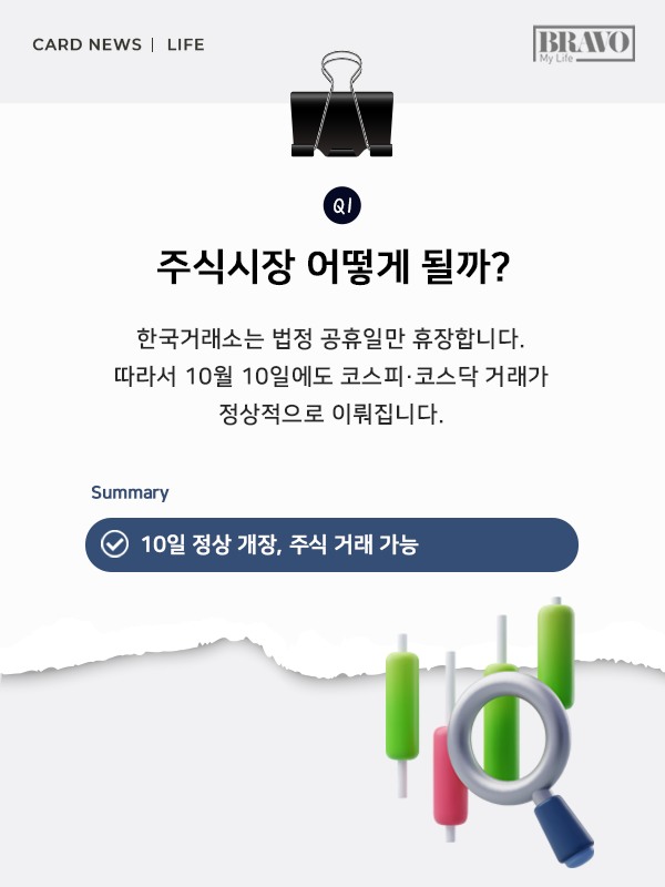 황금연휴가 끝난 뒤 맞이한 10일, 일상은 다시 평일로 돌아왔다. 이날은 임시공휴일이 아니기 때문에 주식시장은 정상 개장하고 은행도 평소처럼 문을 연다. 택배 접수와 배송 역시 차질 없이 진행되며, 직장인 근무수당도 휴일 기준이 아닌 평일 기준으로 계산된다. 달력만 보고 헷갈리기 쉬운 일정이지만 실제로는 전국이 평일처럼 움직이고 있는 것이다. 그렇다면 10일, 금융시장과 은행, 택배, 근로수당에는 어떤 변화가 있을까. 카드뉴스로 하나씩 짚어본다.