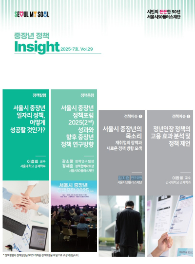 서울시50플러스재단이 16일 ‘중장년 정책 Insight’ 2025년 7호를 발간했다. 이번 호는 지난달 23일 열린 ‘서울시 중장년 정책포럼 2025(2nd)’의 발표 내용을 토대로, 중장년 일자리 정책의 방향과 과제를 데이터에 근거해 정리했다.