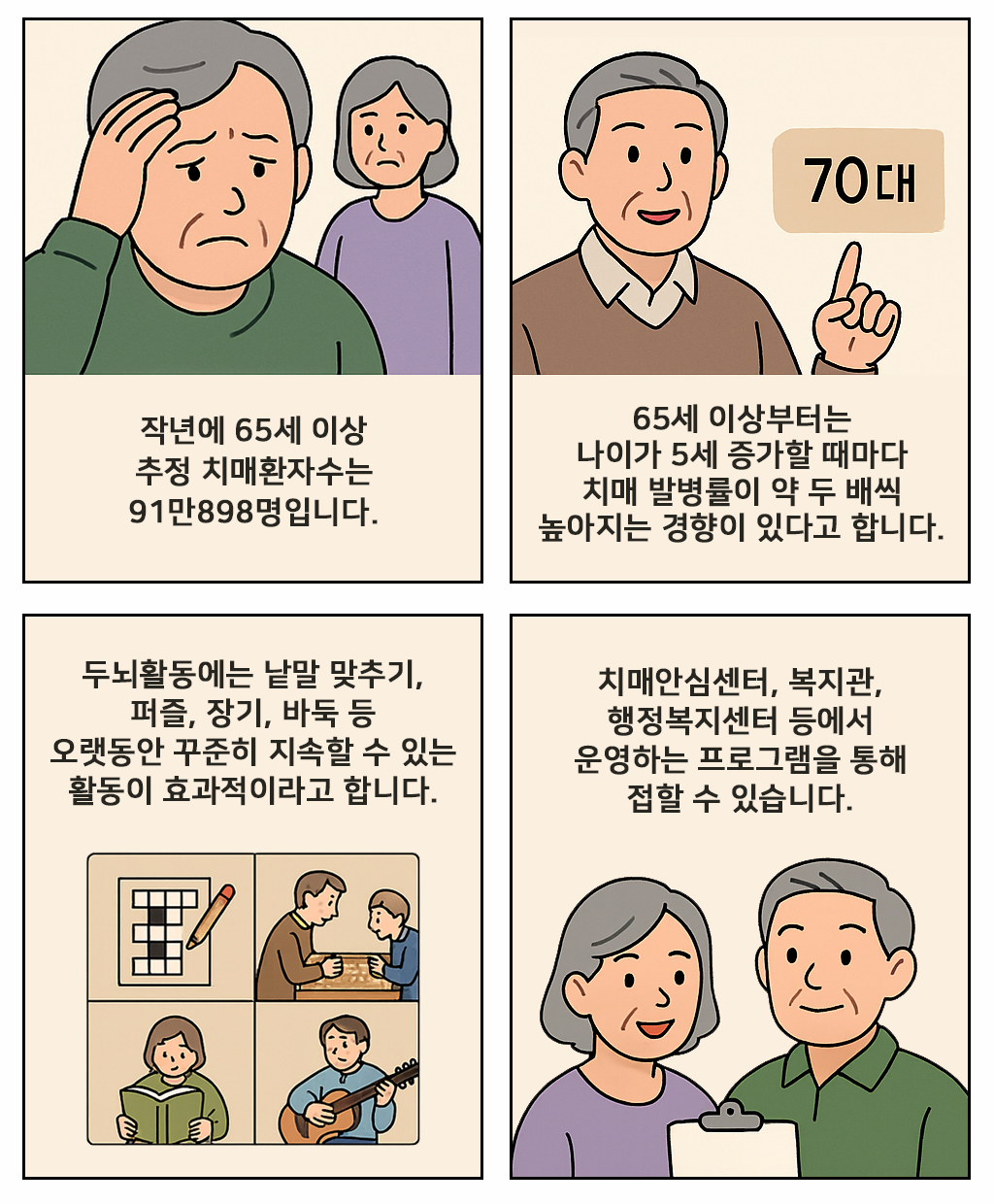 65세 이상부터는 나이가 5세 증가할 때마다 치매 발병률이 약 두 배씩 높아지는 경향이 있다고 합니다. 70대는 치매예방을 위해 더욱 주의 깊은 관리가 필요하다고 합니다.