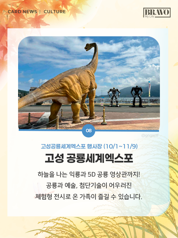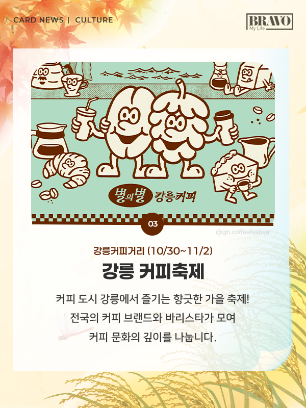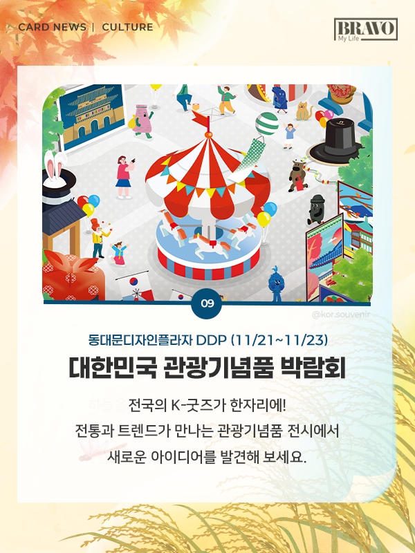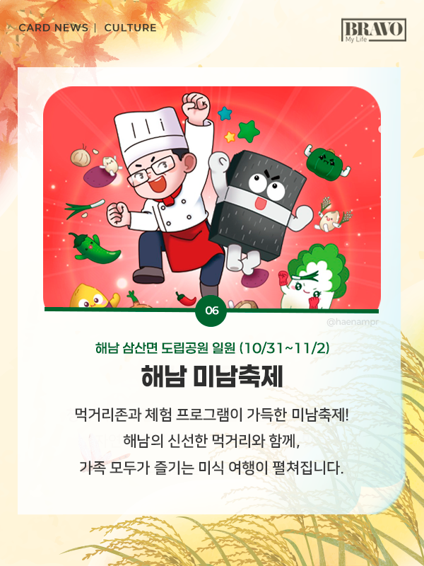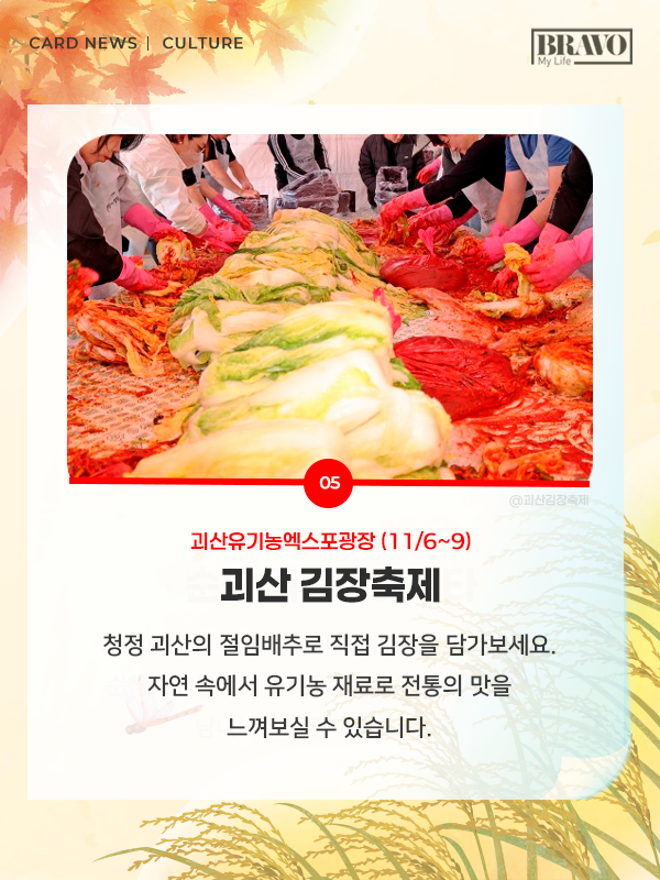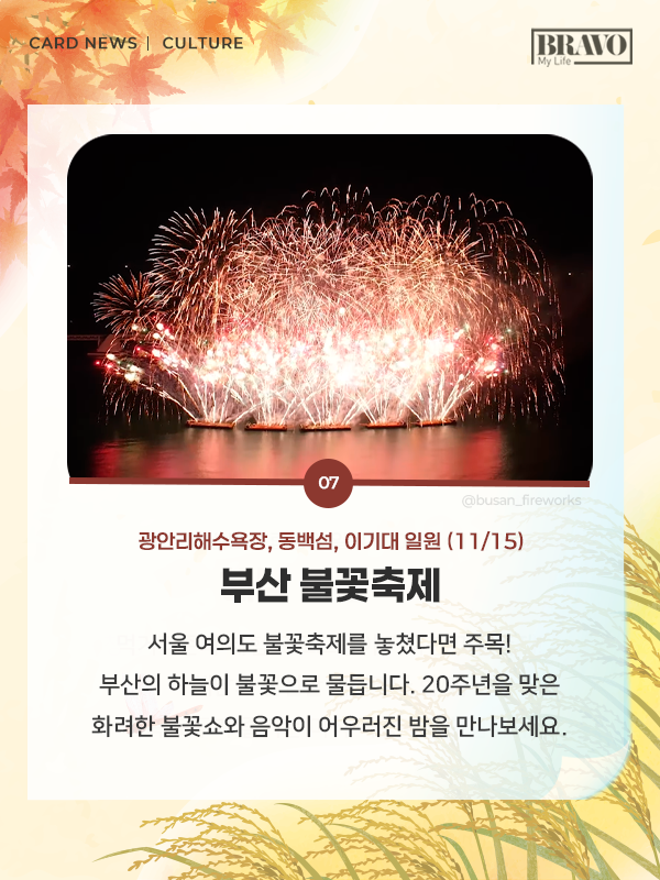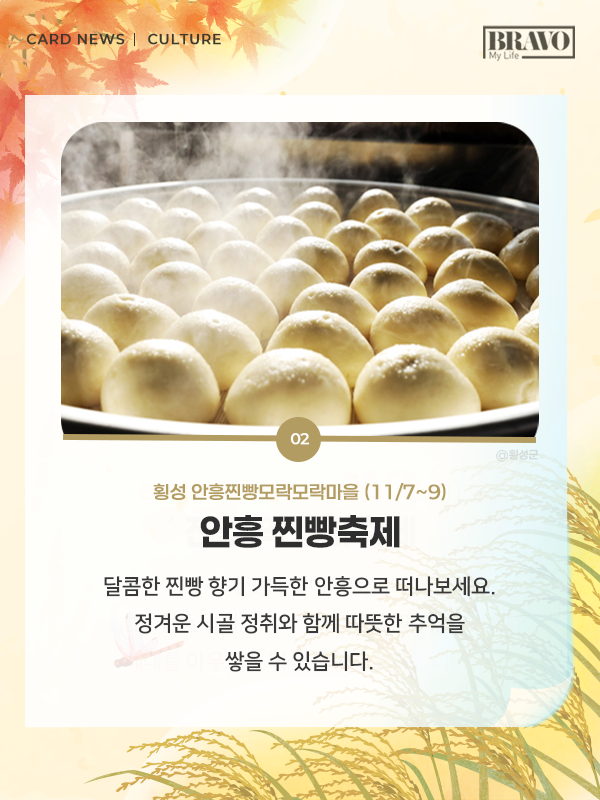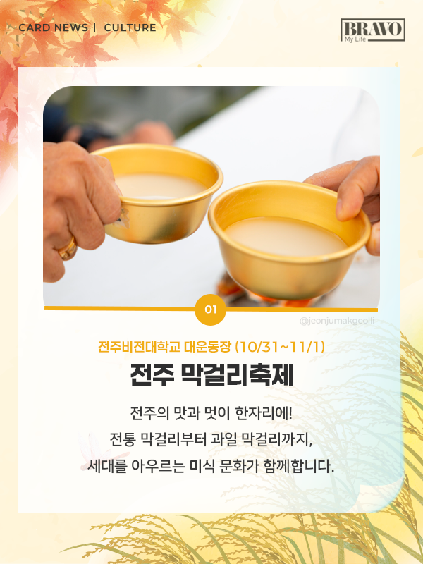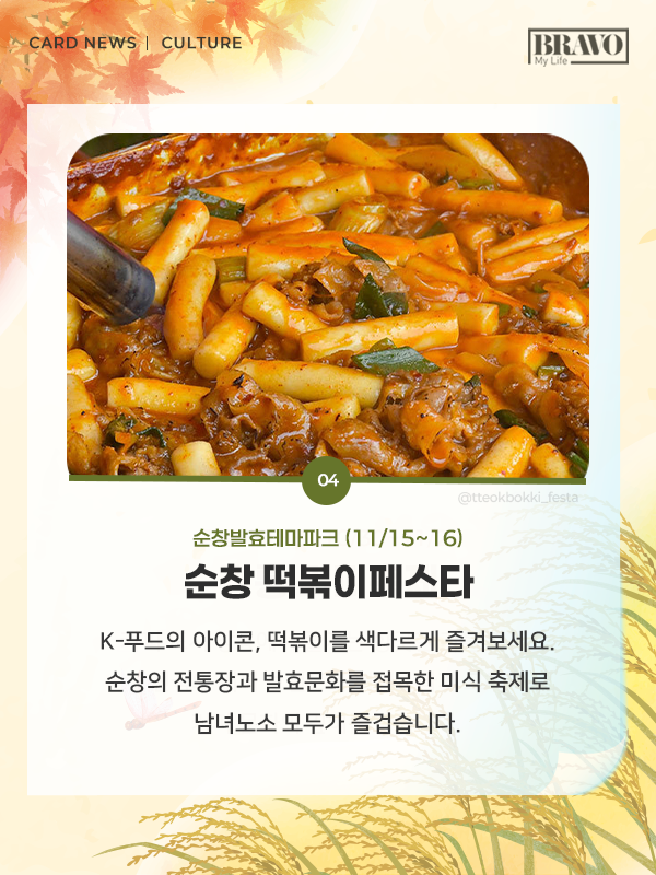 가을을 제대로 즐기고 싶다면, 11월 한 달간 전국 주요 지역에서 열리는 미식 및 관광 축제 일정을 미리 확인해 보자. 자세한 내용은 카드뉴스로 확인할 수 있다.