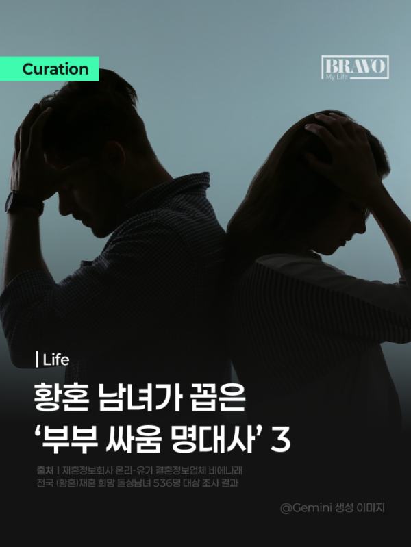 싸움의 이유는 다양하지만, 결국 관계를 지탱하는 건 서로를 이해하려는 태도와 말의 온도다. (황혼)재혼 남녀가 꼽은 ‘부부싸움 명대사’를 카드뉴스로 확인해 보자.