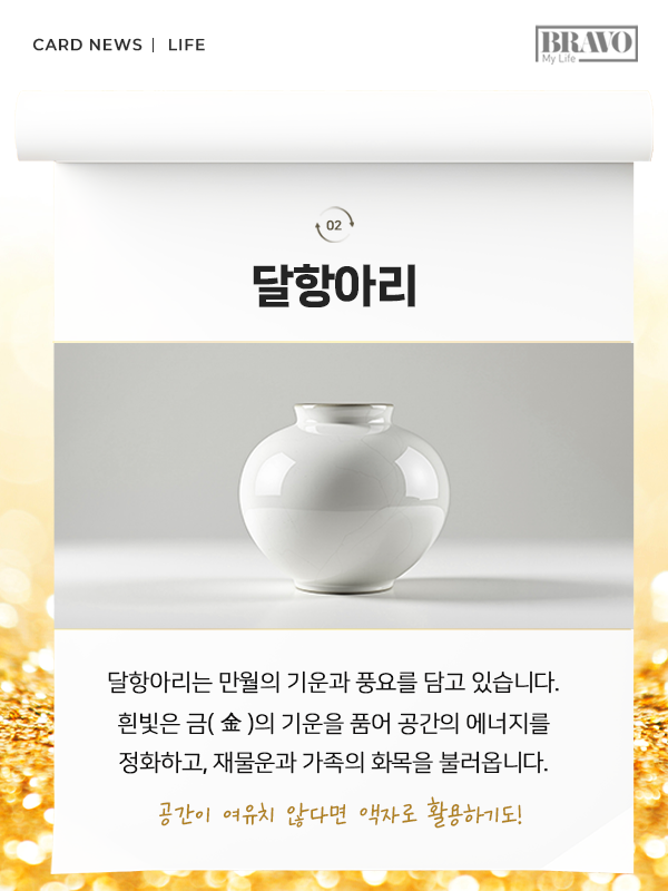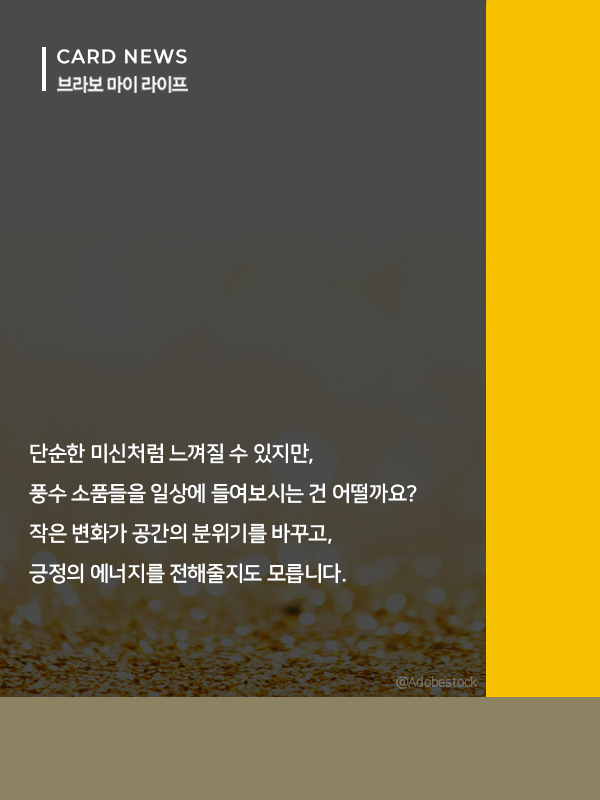 공간에 좋은 에너지를 더하고 싶다면, 풍수 소품을 인테리어에 활용해 보는 것이 어떨까. 좋은 기운을 불러오는 소품들을 카드뉴스로 정리했다.