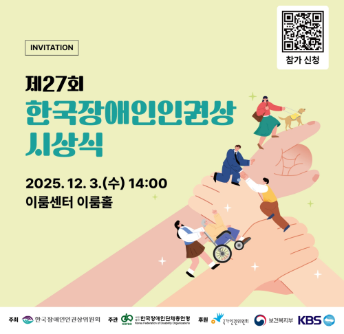 한국장애인단체총연맹이 다음 달 3일 서울 여의도 이룸센터에서 ‘제27회 한국장애인인권상’ 시상식을 연다. 장애인 인권 증진에 기여한 개인과 기관을 선정해 포상하는 이 상은 1998년 UN의 ‘장애인권리선언’ 정신을 계승해 시작됐으며, 올해 다섯 개 부문에서 총 7명의 수상자가 결정됐다.