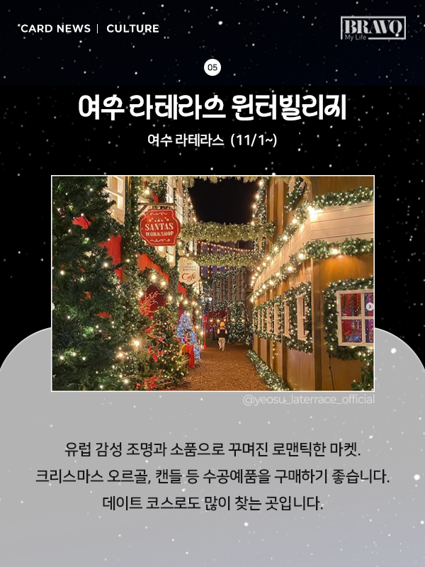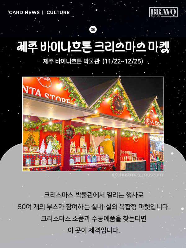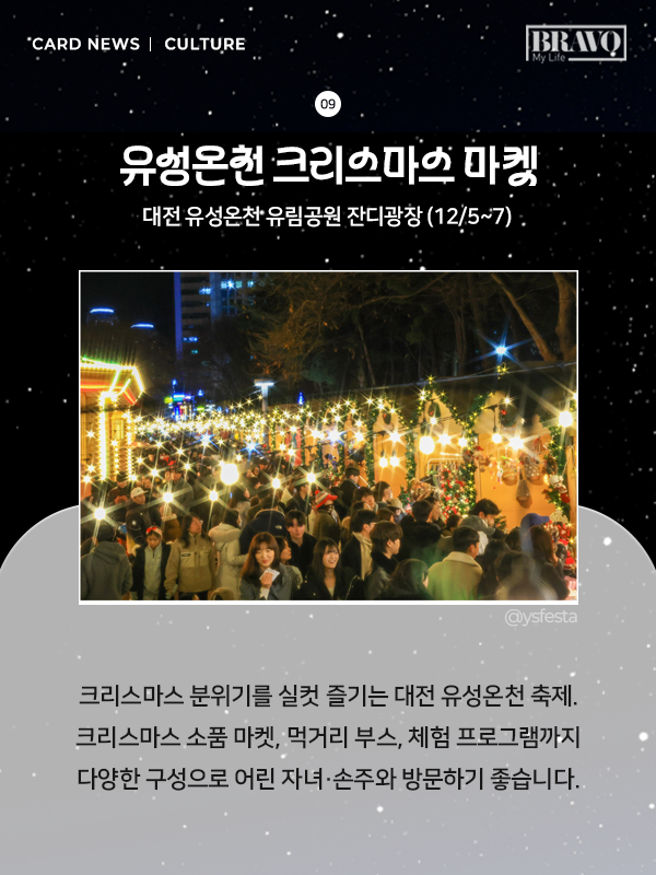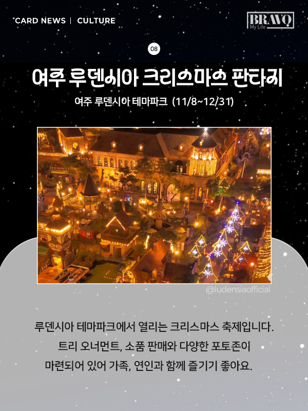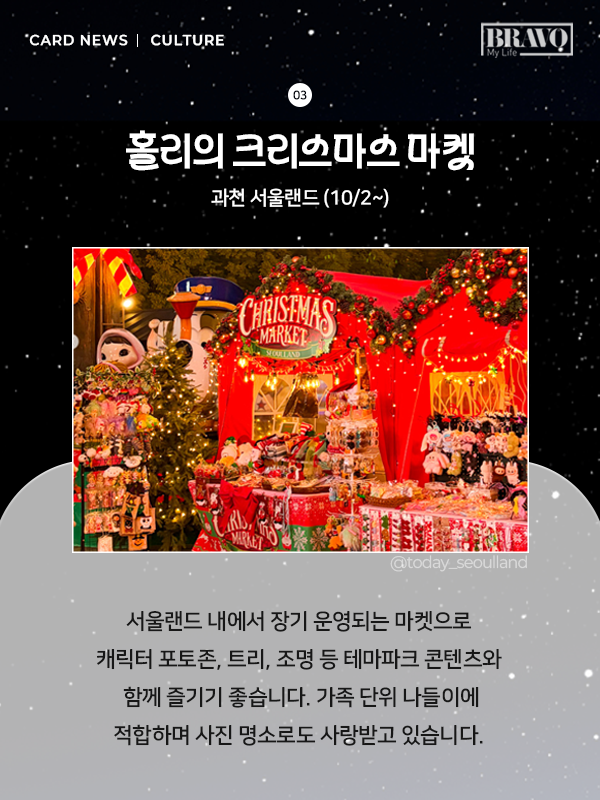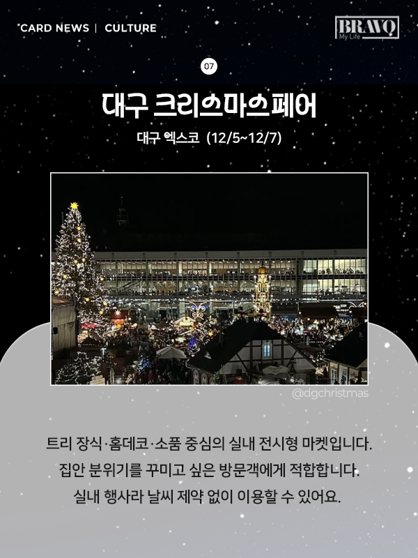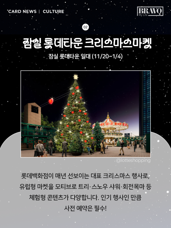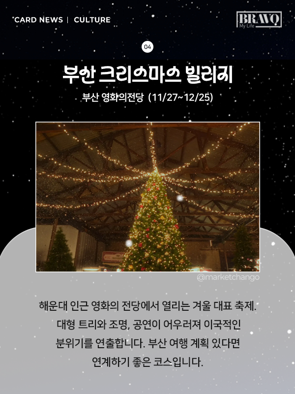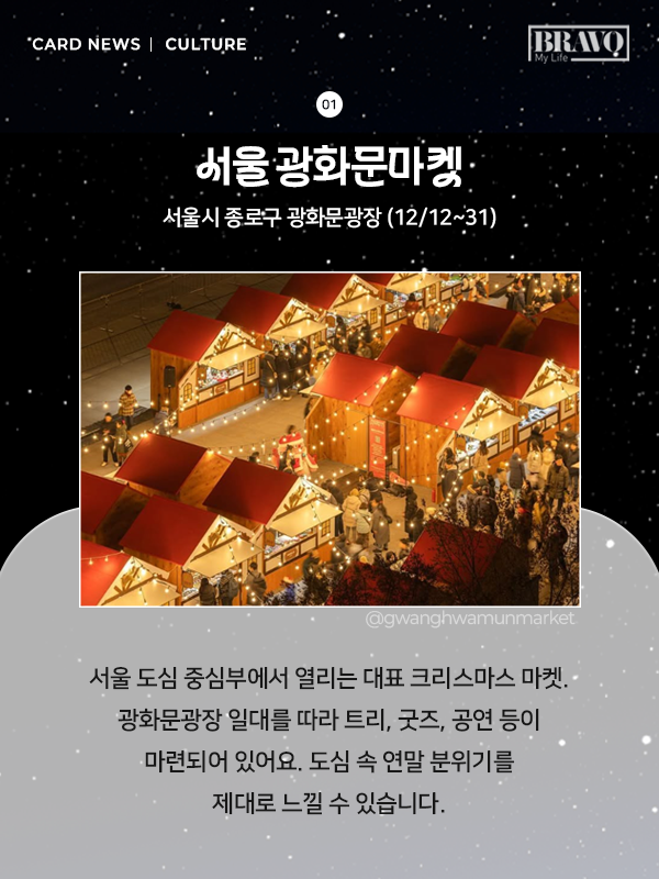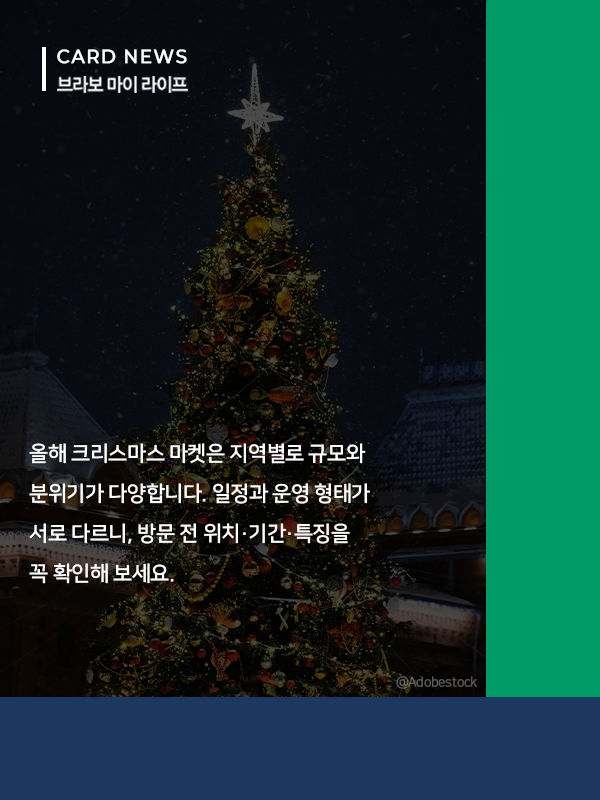 올해 크리스마스를 어디서 어떤 분위기로 즐길지 고민된다면, 카드뉴스를 참고해 보자. 지역별 특징과 일정을 한눈에 정리해 두어 자녀·손주와 함께 겨울 나들이를 계획하기에도 제격이다.