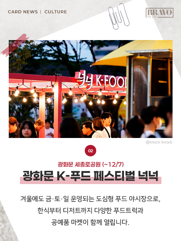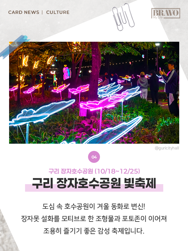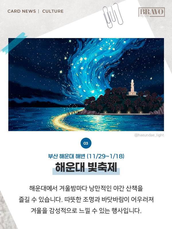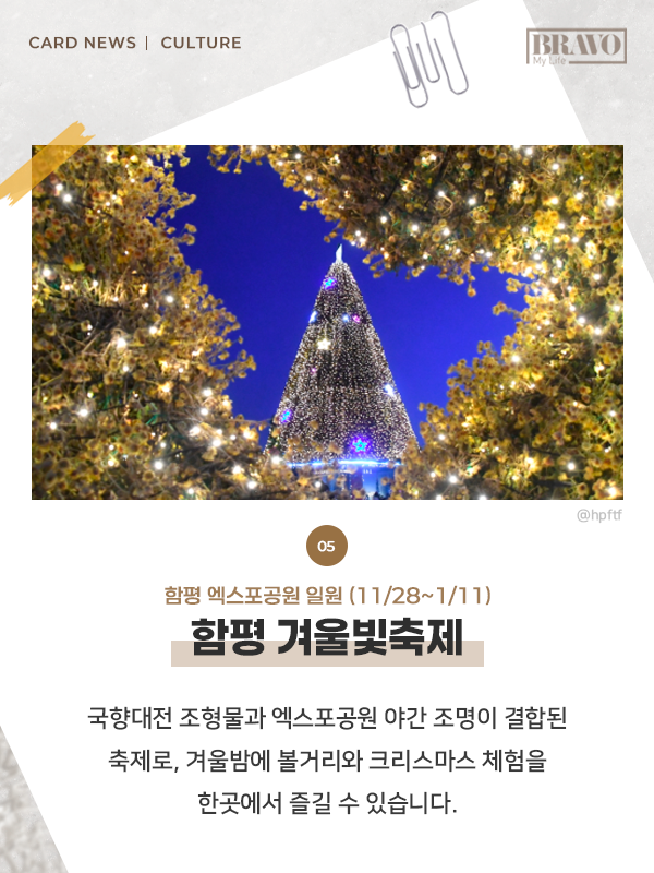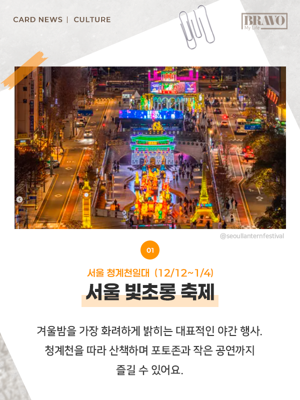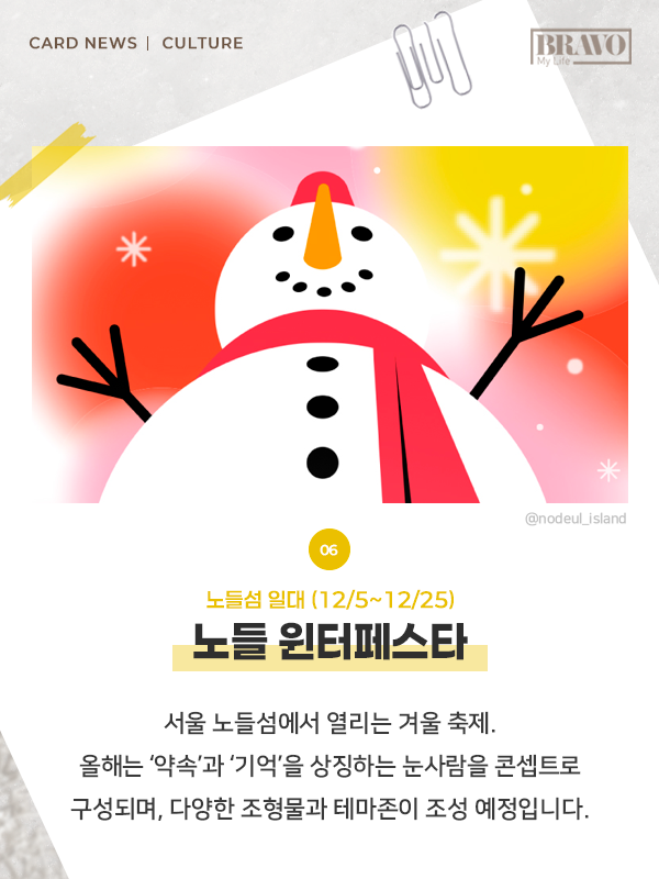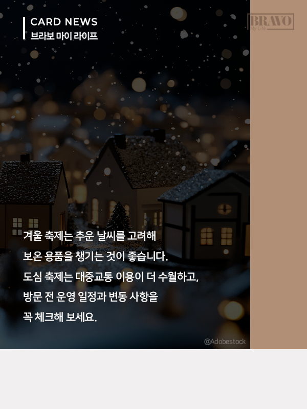 올겨울 가볼 만한 축제를 찾고 있다면 카드뉴스로 정리한 주요 일정을 확인해 보자. 핵심 정보와 장소를 한눈에 살펴볼 수 있다.