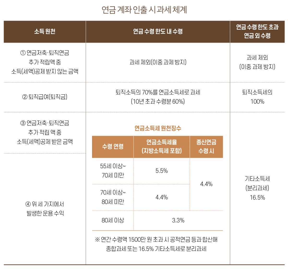 연금 계좌에 납입해 세액공제를 받은 금액과 연금 계좌 내에서 발생한 운용 수익은 연금으로 인출할 때 저율의 연금소득세(3.3~5.5%)가 과세된다. 저율의 연금소득세를 적용받기 위해서는 ① 최소 5년 이상 가입 ② 55세 이후 연금 개시 ③ 연간 연금 한도 내 연금으로 인출을 지켜야한다. 단, 연간 1500만 원을 초과해 인출할 경우에는 인출하는 전체 금액에 대해 분리과세(16.5%) 혹은 다른 소득과 종합과세(다른 소득과 합산) 중에서 선택해야 한다. 하지만 연금 계좌에서 인출하는 금액이 세액공제를 받지 않은 금액이라면 아무런 세금이 없다. 연간 1500만 원을 초과해 인출해도 역시 세금이 없다.