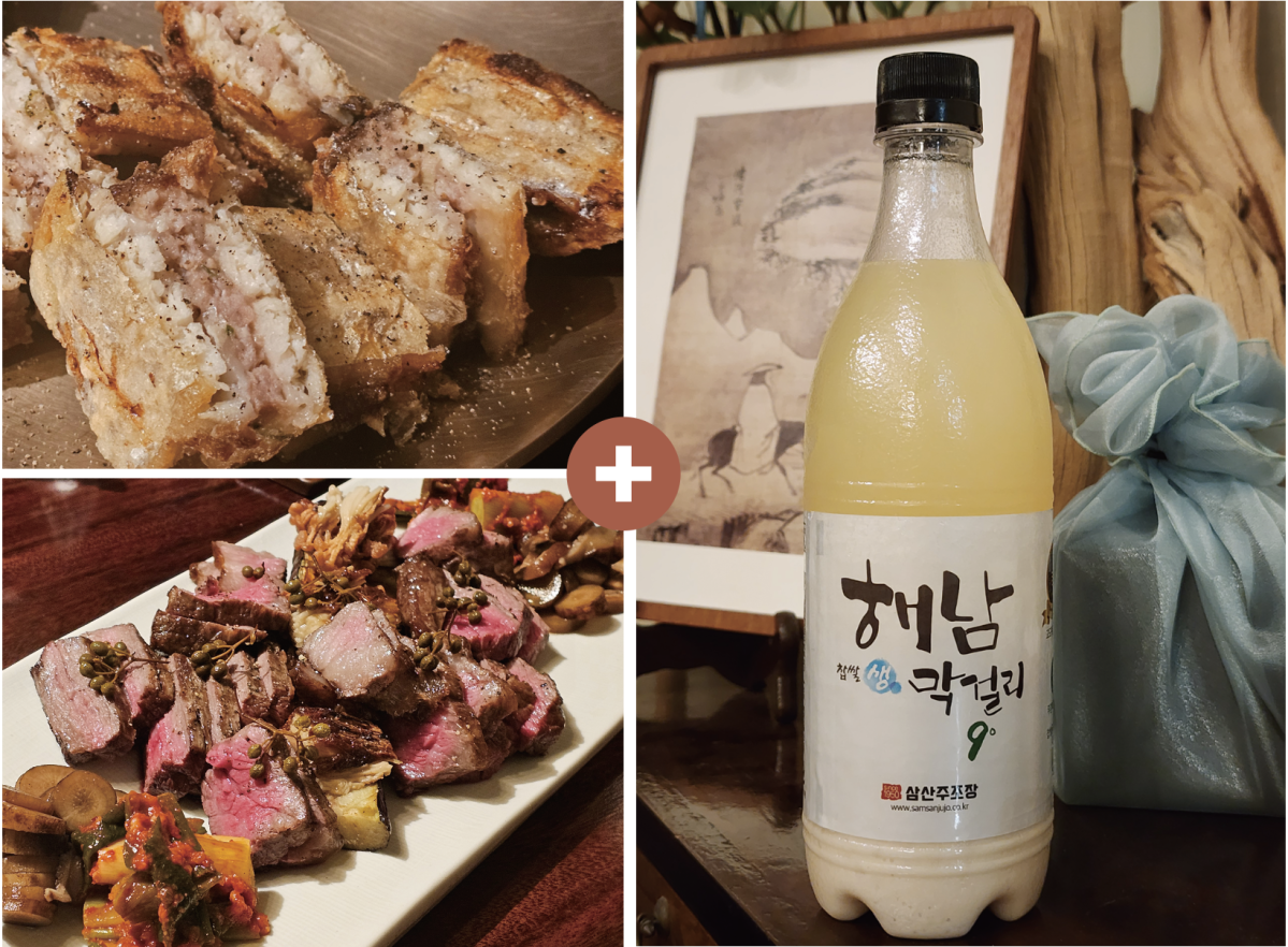 이 막걸리를 판매하는 ‘얼쑤비스트로’의 맡김차림상과의 페어링을 추천한다. 반가 음식을 공부하는 조성주 셰프가 제철 식재료를 활용해 전통적인 한식 안주를 선보인다. 맡김차림상은 주인의 재량에 상차림을 맡기는 것으로, 오마카세라는 일본어가 무분별하게 남용되는 걸 피하고자 우리 식으로 지은 용어다. 이번에 택한 저녁 맡김차림상은 인당 8만 9000원에 총 8개 코스를 낸다. 계절 죽–나물 등 한입거리–수란채–육전–갈치만두–고기구이–식사(밥, 국, 반찬)–아이스크림 코스가 일반적이다.