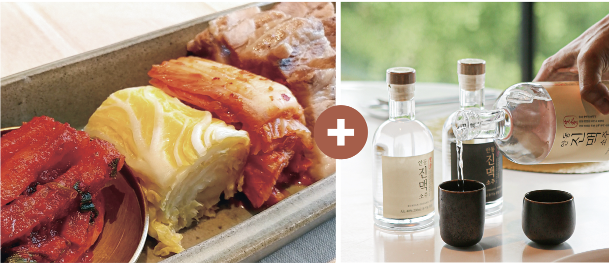 아무리 신선한 재료라 해도 돼지고기 특유의 냄새는 있을 수 있는데, 이때 통밀을 사용한 밀소주인 진맥소주를 곁들인다. 한입 머금는 순간 불필요한 냄새를 깔끔하게 잡아준다. 쌀과는 또 다른 밀 향의 술과 보쌈의 녹진한 맛의 조합은 다른 곳에서 맛보기 힘든 특별한 경험이 된다.