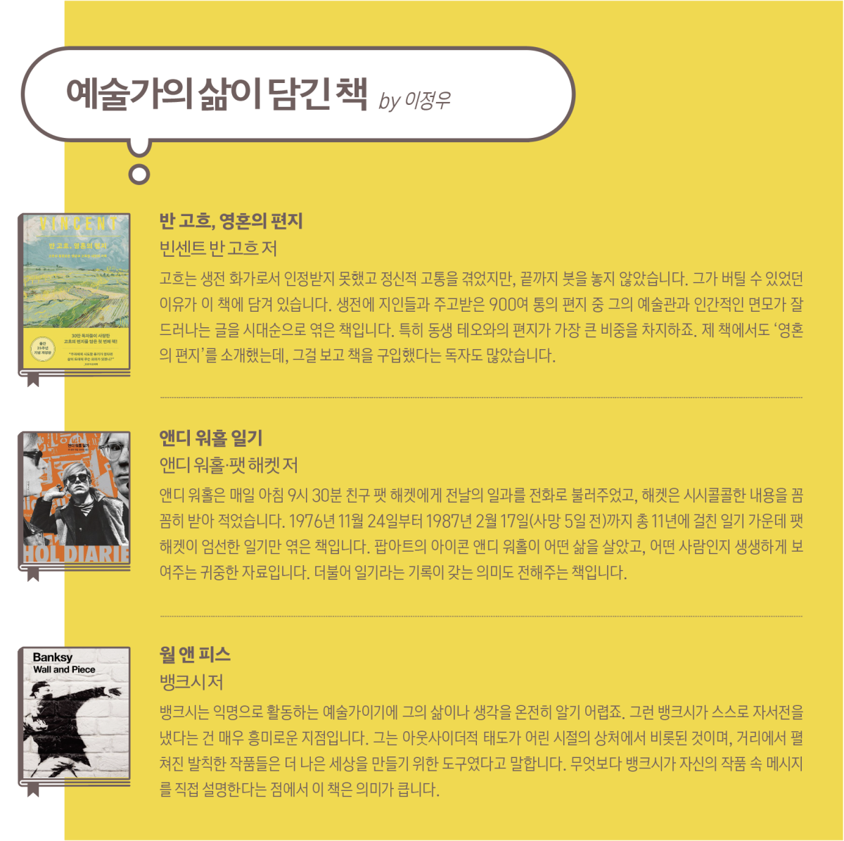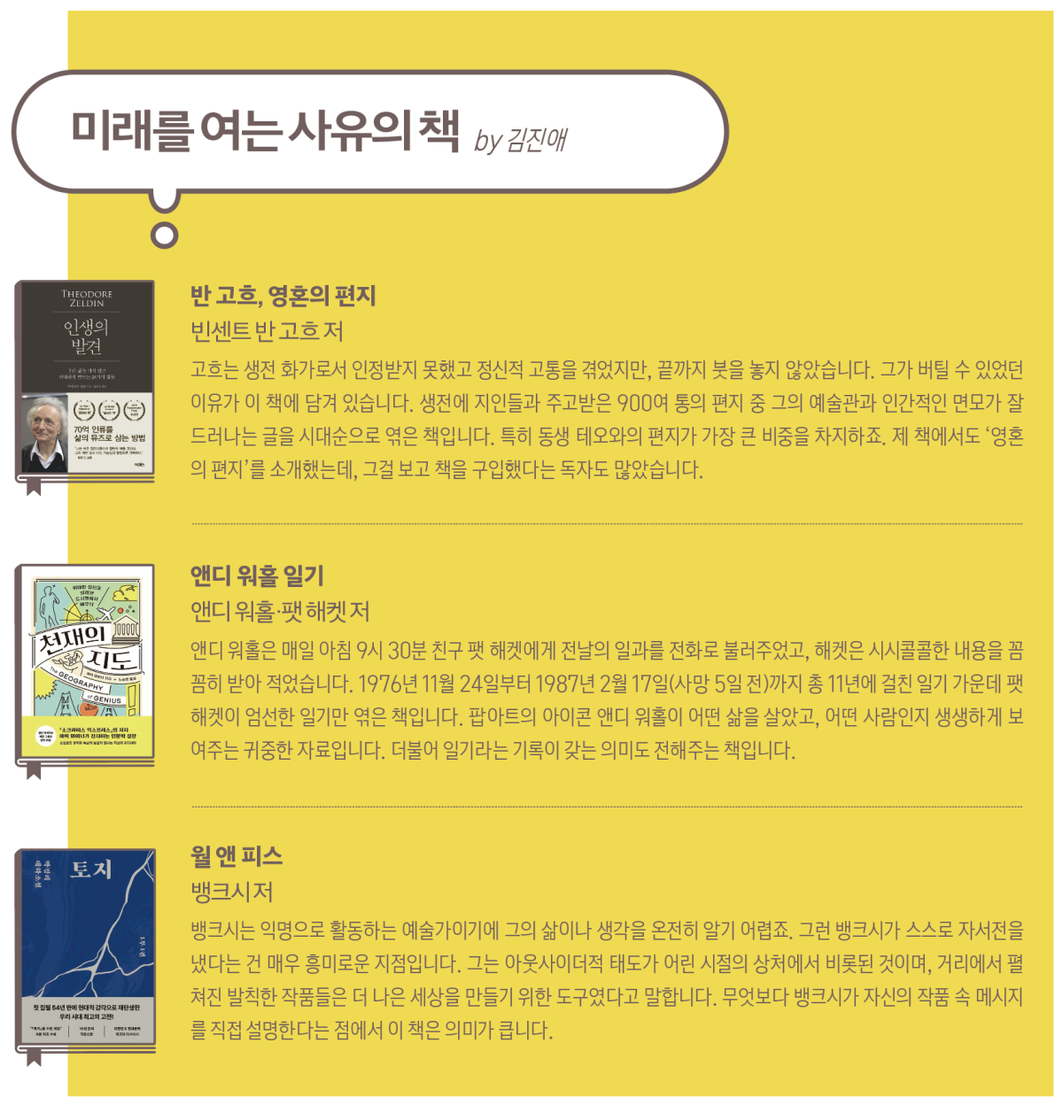 저는 개인적으로 고흐를 쓰면서 큰 감동을 받았습니다. 반 고흐를 원래 좋아했지만, 이번에 그의 편지를 모은 책 ‘영혼의 편지’를 읽으며 당시의 절절한 심정과 예술을 향한 집념이 깊게 와 닿았거든요.