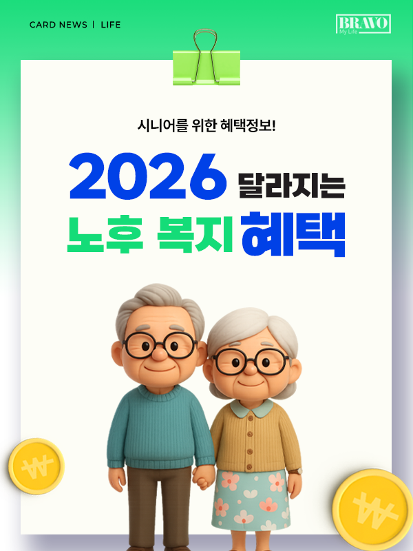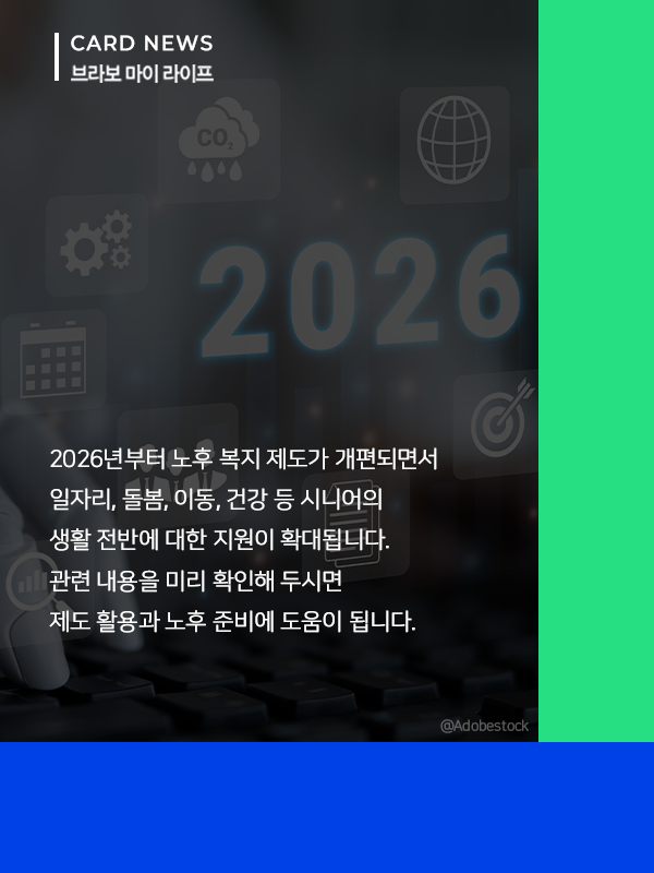 부모님 세대라면 자녀가 대신 챙겨드리는 것이 도움이 될 수 있고, 중장년이라면 향후를 대비해 직접 살펴볼 필요가 있다. 2026년을 앞두고 달라지는 노후 복지 제도를 카드뉴스로 정리해 봤다.