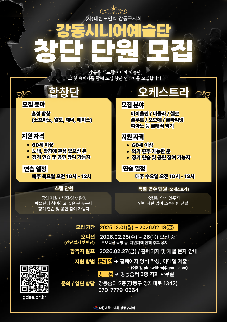 강동구를 대표하는 시니어 예술단인 강동시니어예술단이 창단을 앞두고 합창단과 오케스트라 단원을 공개 모집한다. 이번 모집은 (사)대한노인회 강동구지회가 주관하며, 지역 시니어들이 예술 활동을 통해 무대에 설 수 있는 기회를 제공하기 위해 마련됐다.