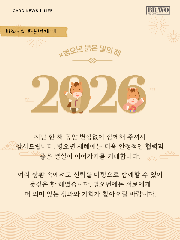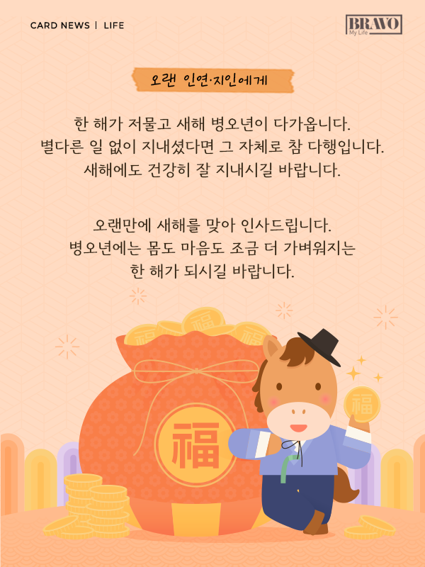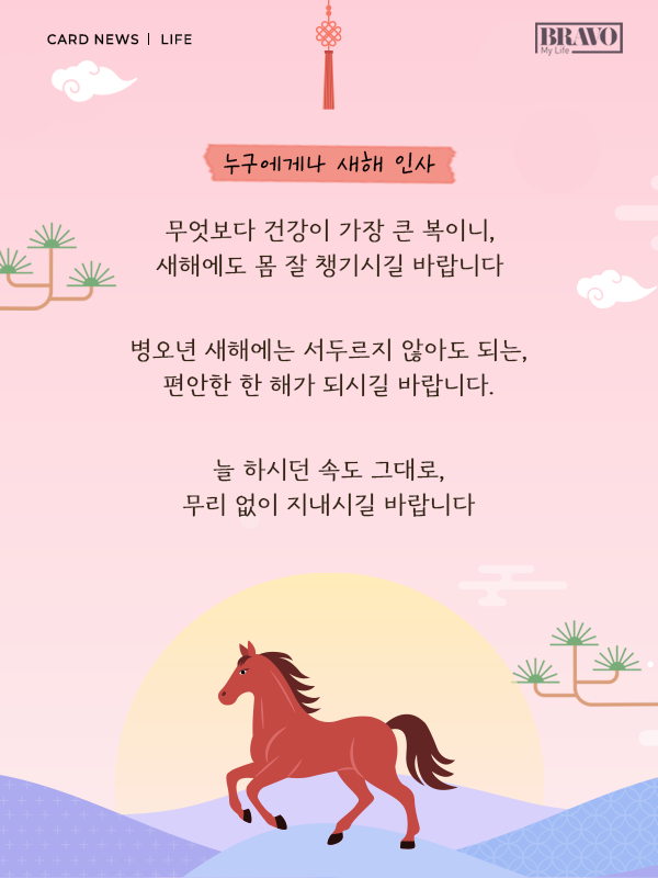밝고 희망찬 새해를 맞아 비즈니스 파트너부터 오랜 인연의 지인까지 상황에 맞는 인사말을 준비해 보는 건 어떨까. 신년 인사말이 고민된다면, 병오년 새해에 어울리는 인사말을 정리한 카드뉴스를 참고해 보자.