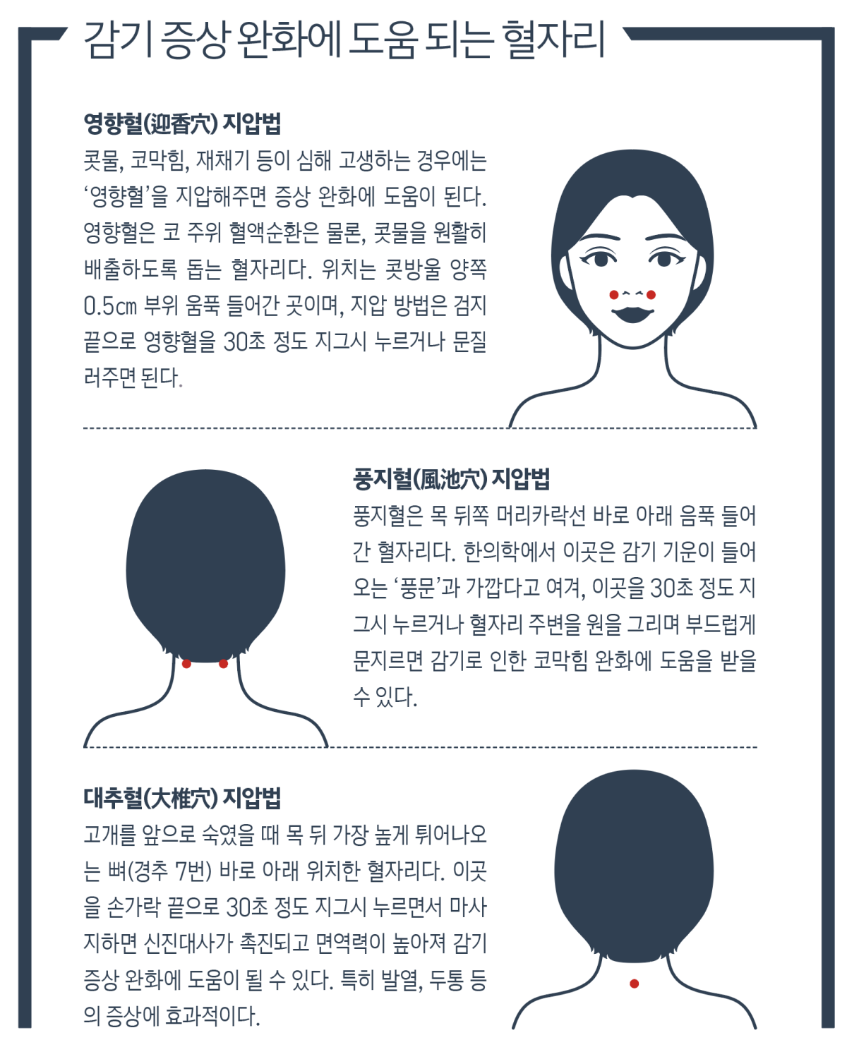 겨울철 독감에 대비하려면 전문적 치료 외에 생활환경 관리에도 신경 써야 한다. 일조량이 줄어드는 시기에는 비타민 D 합성이 감소해 면역기능이 떨어질 수 있으므로, 가벼운 산책이나 규칙적인 운동으로 부족한 햇빛과 활동량을 보완하는 것이 좋다. 또한 혈류 흐름을 원활히 하는 부위를 가볍게 자극해주면 몸의 긴장이 완화되고 컨디션을 유지하는 데 도움이 된다.