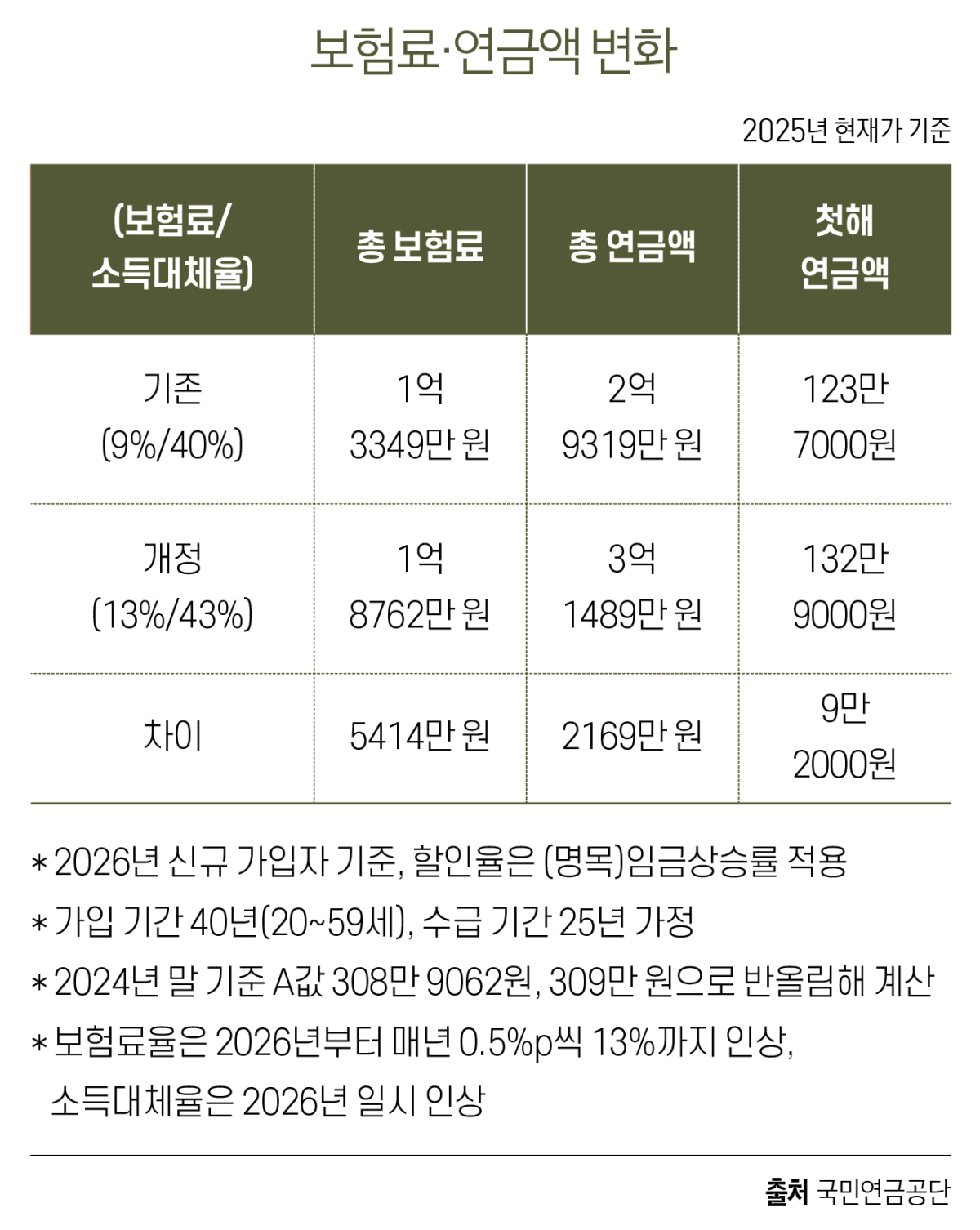 보험료율은 2025년 9%에서 13%로 4%p 인상하되, 2026년부터 매년 0.5%p씩 단계적 인상해 2033년 13%에 도달하도록 했다.