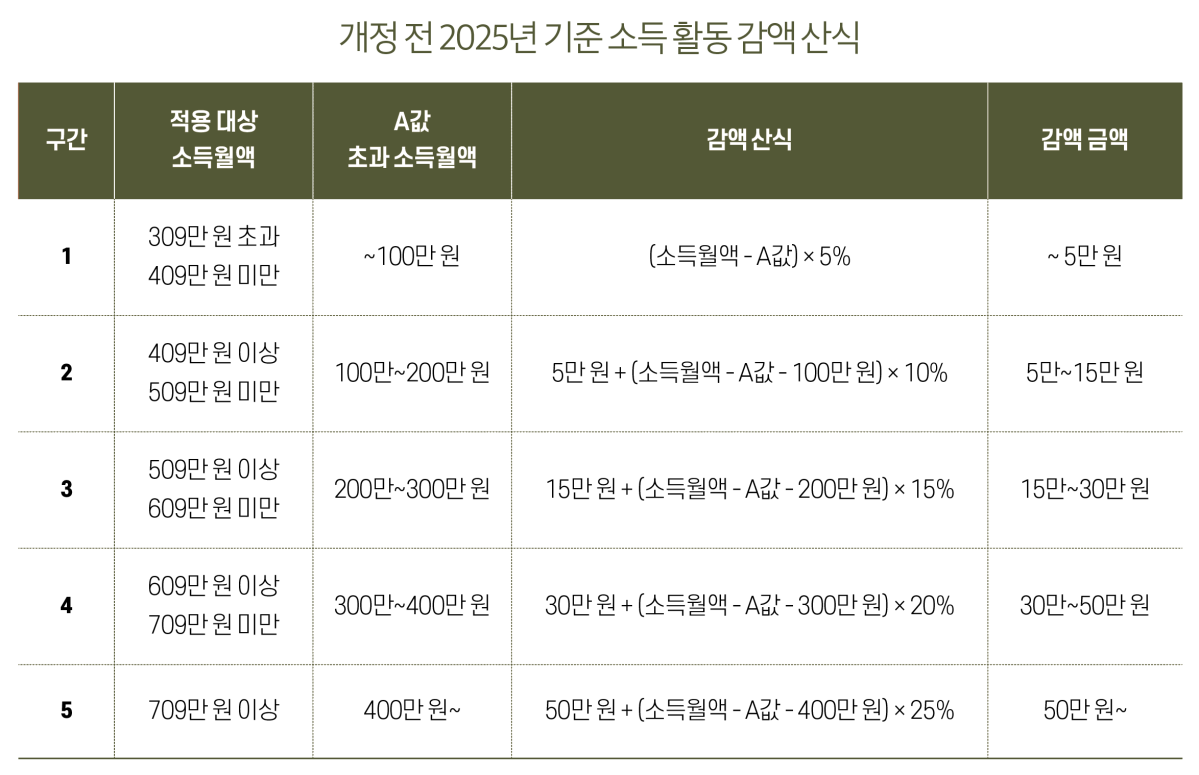 2025년 11월 개정된 국민연금법에는 국민연금 감액제도 개선 내용이 포함돼 있다. 기존에는 국민연금 전체 가입자의 3년간 평균 소득(이하 A값)보다 근로·사업소득이 많은 경우, 초과하는 월 소득을 100만 원 단위의 5개 구간으로 나누어 5~25%에 해당하는 금액을 연금액에서 감액했다.