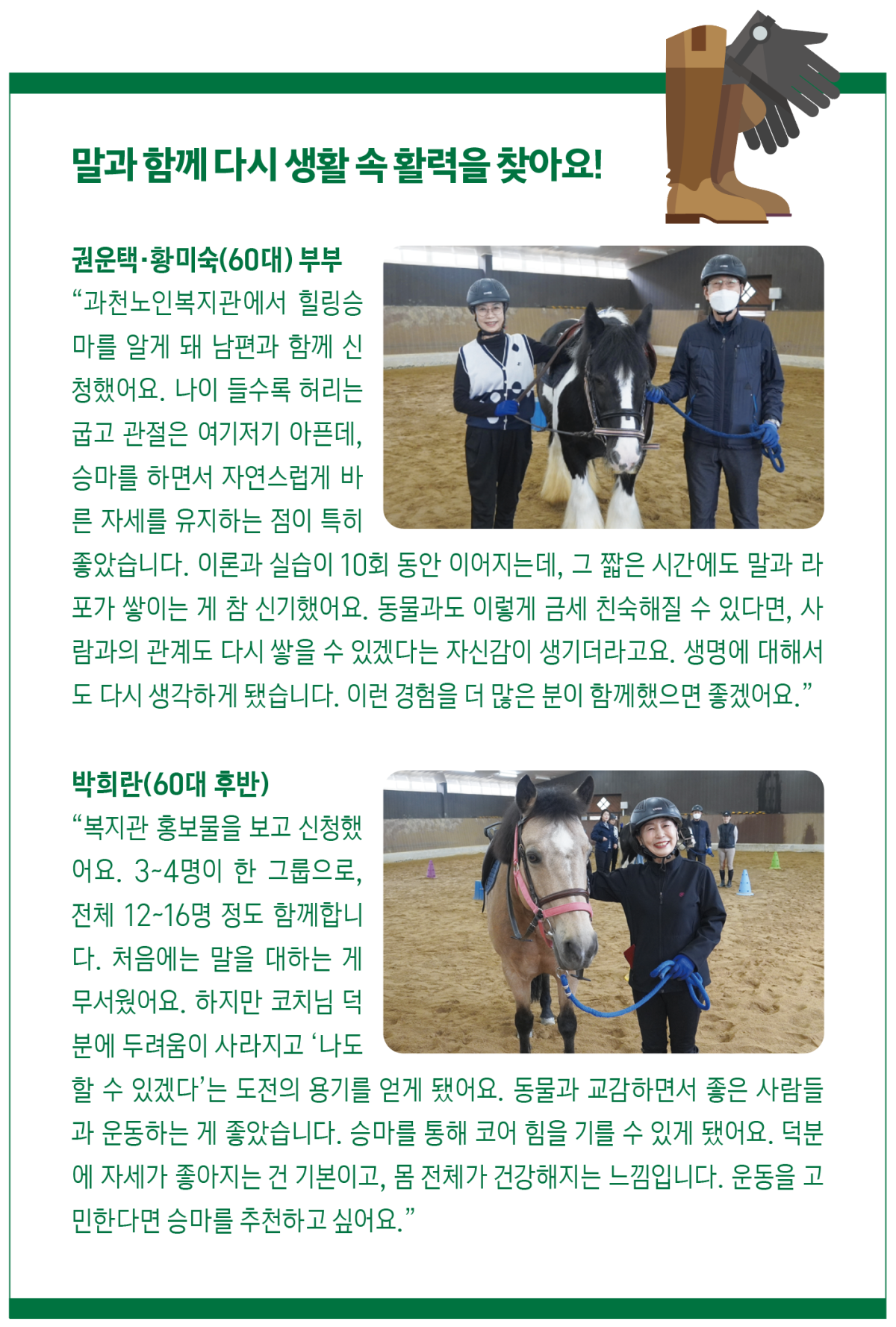 이런 경험이 시니어의 자기효능감 회복에 중요한 역할을 한다고 본다. ‘할 수 있다’는 감각이 쌓일수록 시니어는 다시 일상 속 선택과 도전에 나설 힘을 얻는다. 말이라는 상징적인 동물을 매개로 다시 설렘을 느끼고, 몸을 움직이며, 하루를 기대하는 경험. 실버승마는 시니어에게 이렇게 말한다.