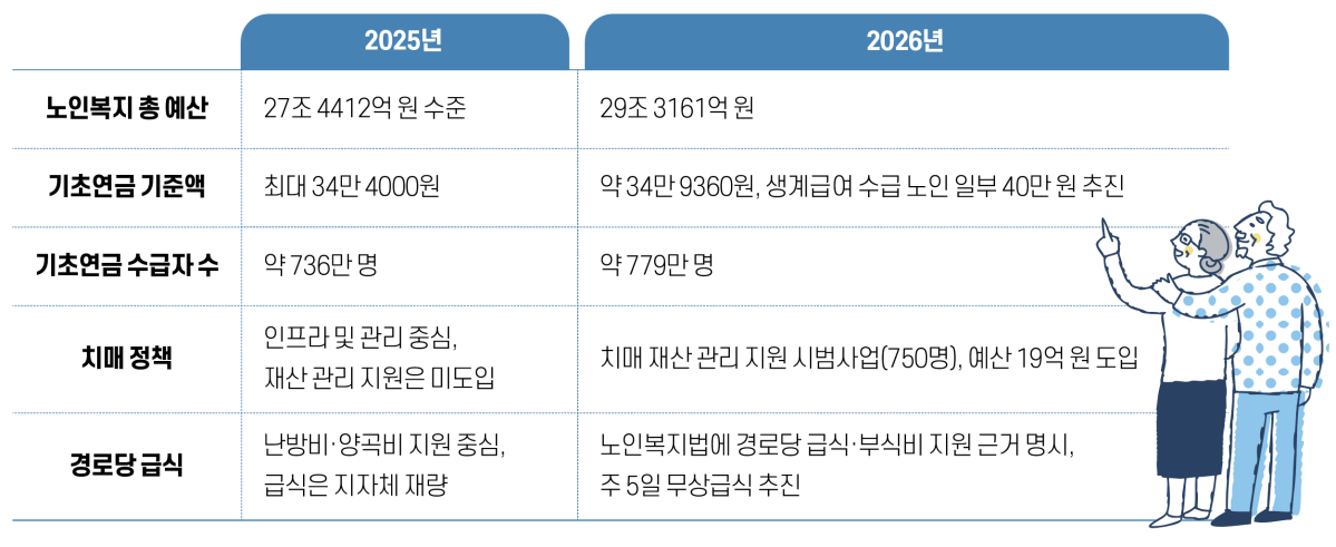 정부가 2026년 노인복지 예산을 2025년 27조 원대에서 29조 3161억 원 수준으로 늘리며 초고령사회 대응에 속도를 내고 있다. 소득·돌봄·건강·여가를 아우르는 패키지형 지원이 확대되면서 65세 이상 노인의 생활 전 영역이 정책 대상에 포함되는 구조로 재편하는 것이 특징이다.