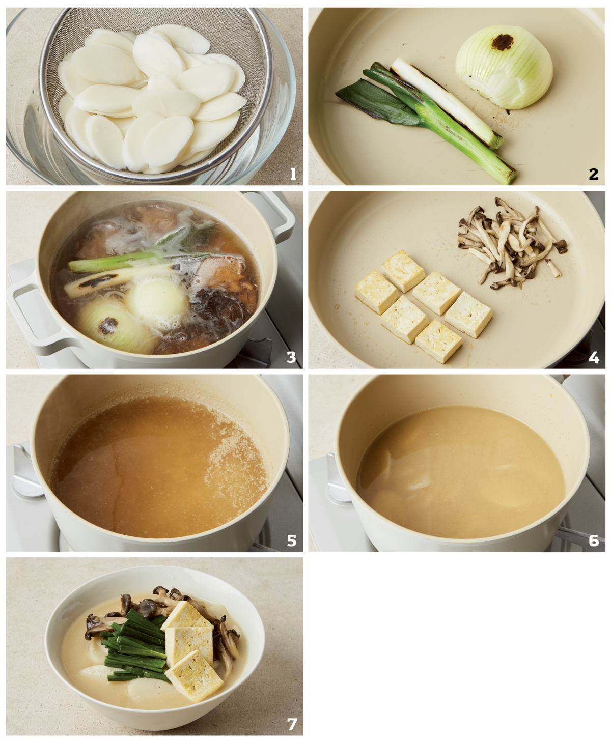 1. 두부는 한입 크기로 자르고, 부추는 4㎝ 길이로 썰고, 느타리버섯은 낱낱이 가른다. 떡국떡은 물에 넣어 15분간 불린 뒤 체에 밭쳐 물기를 제거한다.