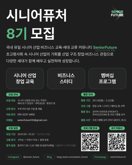 시니어 산업을 ‘복지’가 아닌 ‘산업과 기회’의 관점에서 바라보는 교육 프로그램이 참여자를 모집한다. 시니어 산업 비즈니스 교육·세대 교류 커뮤니티인 시니어퓨처는 초고령사회 속 시니어 산업의 가능성을 주제로 ‘시니어퓨처 8기’ 참여자 모집에 나섰다고 11일 밝혔다.