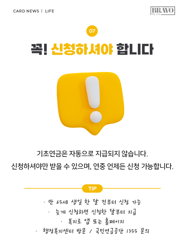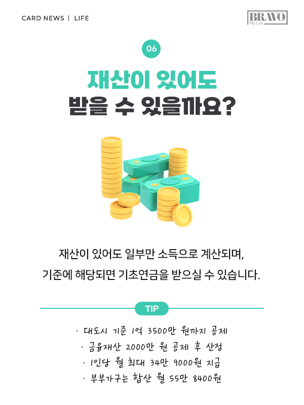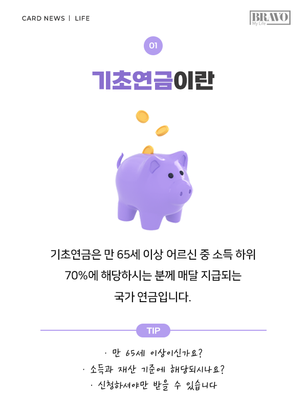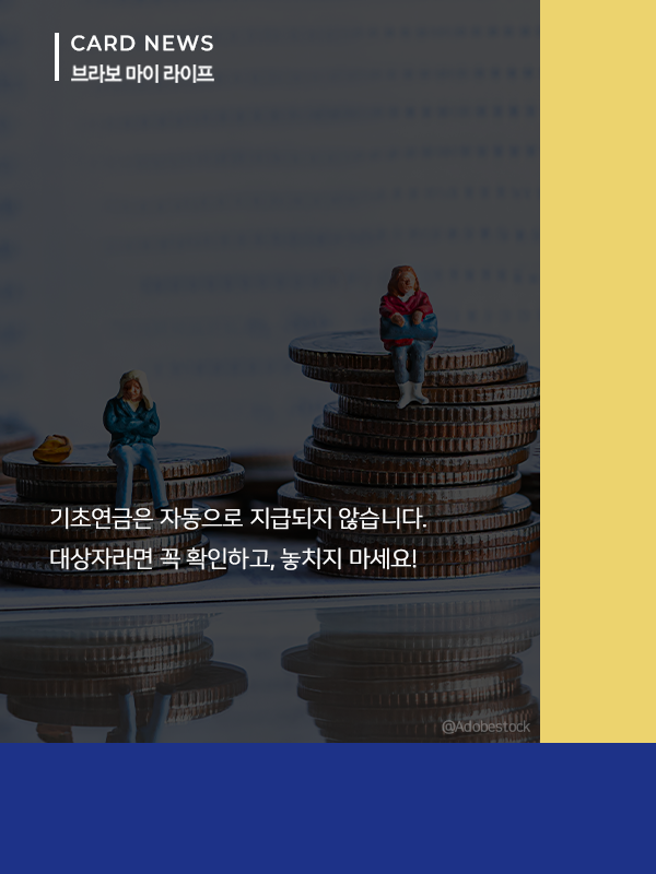 복잡한 계산법 때문에 여전히 수급 자격이 헷갈린다면, 카드 넘겨 내용을 주목해 보자. 대상자라면 놓쳐선 안 될 '기초연금의 모든 것'을 알기 쉽게 정리했다.