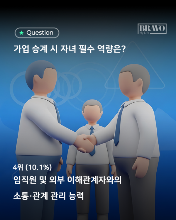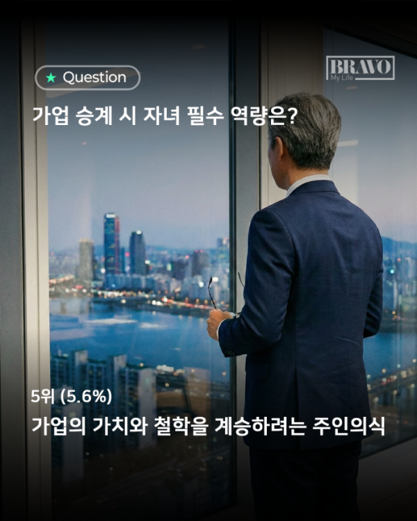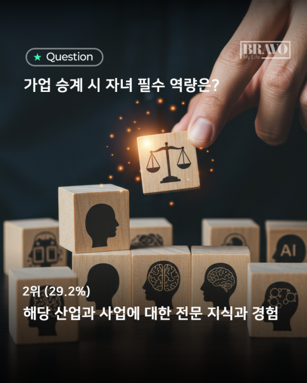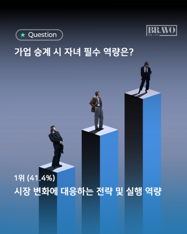 가업을 자녀에게 물려줄 때, 6070세대 부모들이 가장 중요하게 보는 것은 치열한 시장에서의 생존 능력인 것으로 나타났다. 가업 승계를 감정이나 명분의 문제가 아닌, 냉정한 경영 판단의 영역으로 바라보는 인식이 뚜렷해지고 있는 것이다.