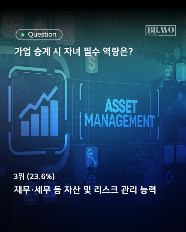 이는 자산가 부모들이 승계를 단순한 부의 이전이 아닌 ‘지속 가능한 기업 운영’의 관점에서 바라보고 있음을 보여준다. 자녀가 시장을 읽는 통찰력과 더불어, 사업의 근간이 되는 재무 구조와 법·세무 리스크까지 감당할 수 있는 준비된 경영자로 성장하길 바라는 기대가 담겨 있다.