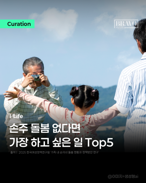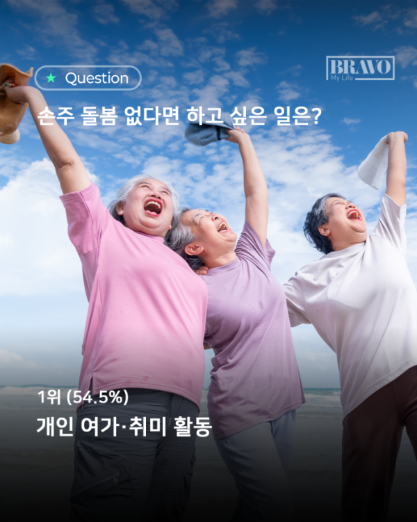 손주 돌봄에서 벗어날 경우 조부모가 가장 하고 싶은 일은 ‘개인 여가·취미 활동’인 것으로 나타났다. 한국여성정책연구원이 2025년 발표한 '가족 내 손자녀 돌봄 현황과 정책방안 연구'에 따르면, 손자녀 돌봄을 하지 않게 될 경우 하고 싶은 활동으로 ‘개인 여가·취미 활동’을 선택한 비율이 54.5%로 가장 높았다. 이어 ‘건강관리’가 15.5%로 2위를 차지했고, ‘친목활동’(12.5%), ‘경제활동’(6.9%), ‘종교활동’(4.3%)이 뒤를 이었다. 손주 돌봄이 일상화된 조부모 세대에게 가장 우선되는 바람은 또 다른 역할이 아니라, 그동안 미뤄왔던 자신의 시간을 되찾는 데 있음을 보여주는 결과다.